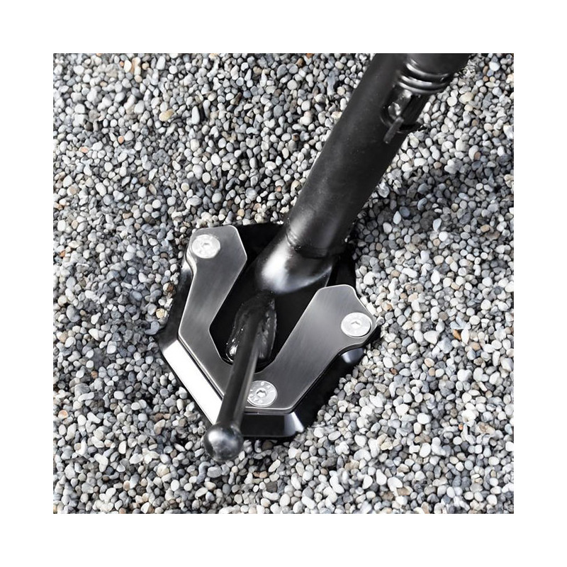 ZIEGERCNC precision machined from high strength aluminum with a strong black powder coated finish. The larger contact surface of the side stand / jiffy stand helps prevent the side stand sinking into dirt or other soft surfaces. The clamping plate and screws are stainless steel. - Helps prevent tip-overs on soft surfaces - No modifications required - Easy bolt-on installation - Includes stainless mounting hardware - Compatible with the stock side stand / kick standNote: Will not fit models with 50000264 adventure side stand
