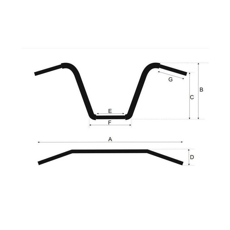 WESTLAND CUSTOMSBars are 32mm (1-1/4") diameter and have a 32mm (1-1/4") diameter riser clamp area and a 1" (25.4mm) grip area. With a powder coated satin gloss black finish. Nothing better than an Apehanger to feel true freedom. From style to quality; these EU made Westland bars tick all the boxes! Note: Cables / wiring / brake lines may require extending. - 1-1/4" (32mm) diameter handlebar - 1-1/4" (32mm) diameter riser clamp area - 1" (25.4mm) diameter grip area- Slotted for internal wiring - Notched for H-D e-throttle (TBW / Throttle By Wire). - Made of certified EN 10305-3 CR1 E195 S5) 3mm thick steel tubing - Precision TIG welded - Dimensions 30cm (11") high handlebar: A 930mm; B 300mm; C 300mm; D 160mm; E 140mm; F 350mm; G 200mm