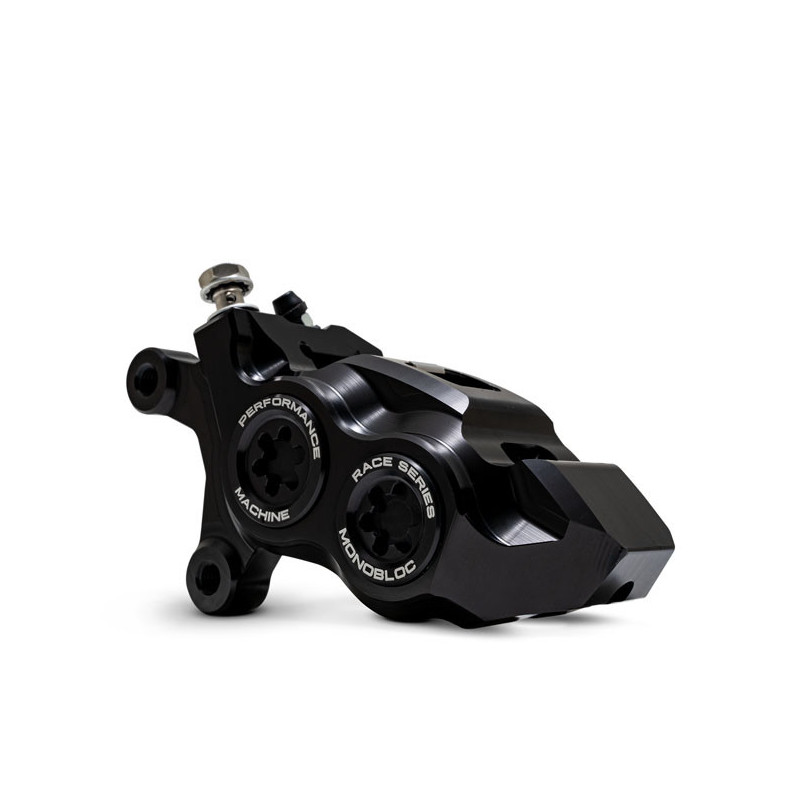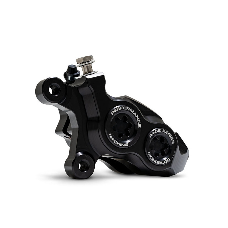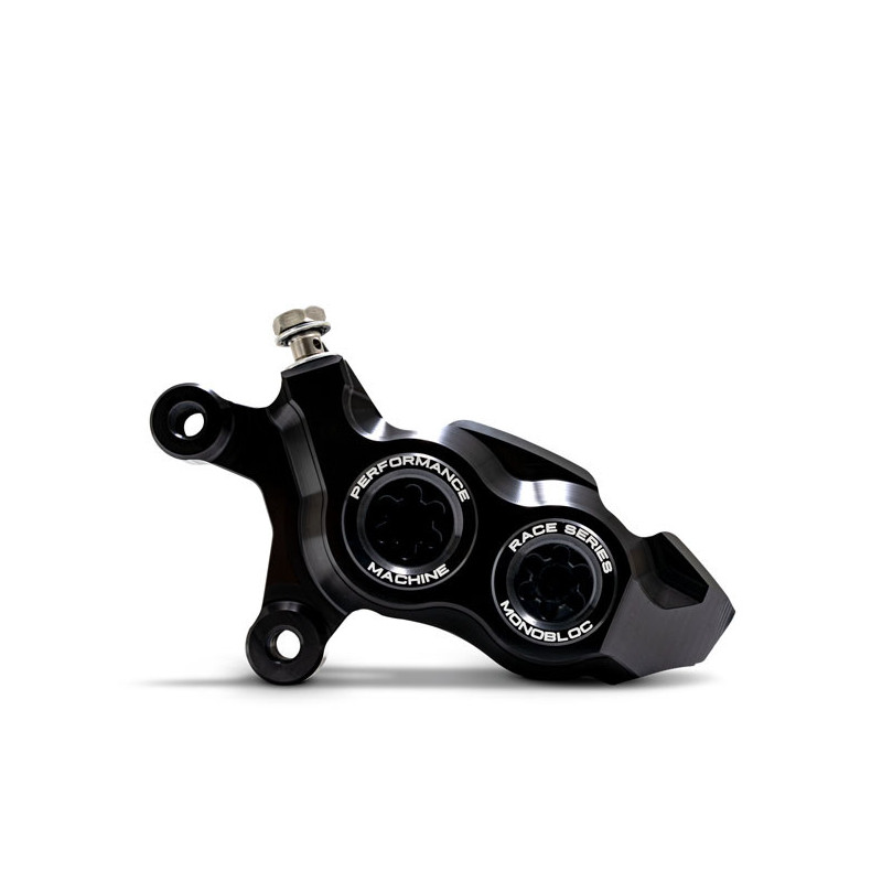 Performance MachineBlack anodized finish. CNC machined from a single piece of solid billet aluminum. The four differential bore large diameter pistons; combined with the extra rigidity of a monobloc design; provide a staggering 20% increase in stopping power over OEM calipers. Race Series machined billet bore caps with anodized finish and laser engraved Performance Machine logo provide additional style to go with the substantial performance upgrades. - One-piece monobloc construction provides increased braking performance - 4-piston differential bore - 20% better stopping power over OEM calipers - Compatible with ABS and Non-ABS brake systems - Works with OEM or aftermarket master cylinders - Anodized finish for all weather protection - With ''Perf