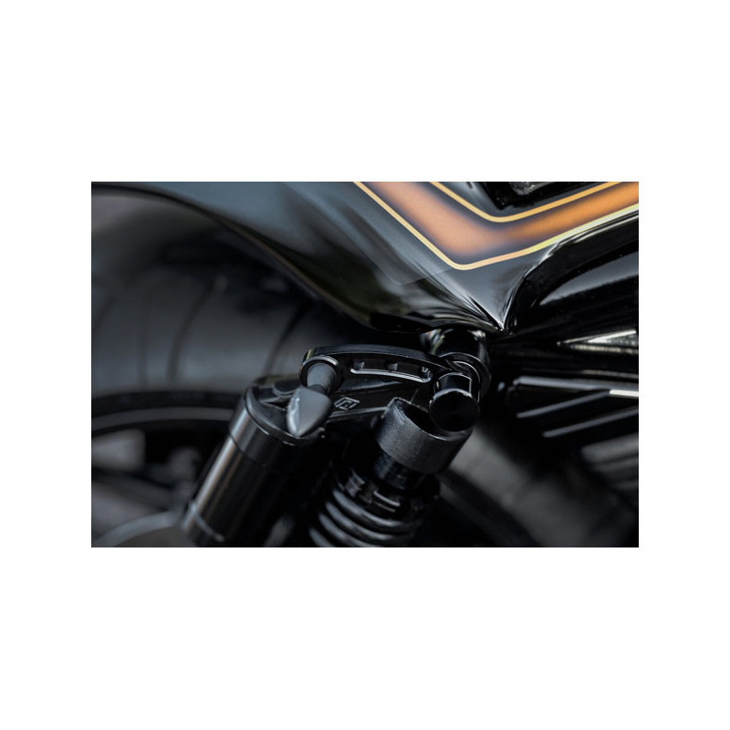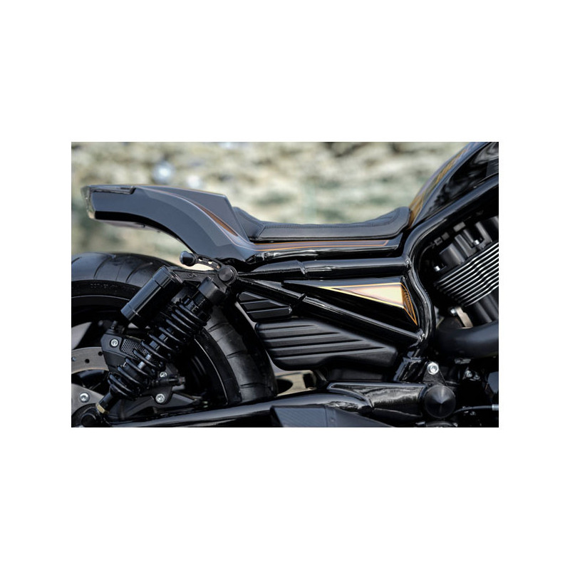 KILLER CUSTOMBlack anodized. Mounts on the outside of the OEM shock absorber; is also compatible with Air Ride systems. CNC machined of billet aluminum with a fluid to match the V-Rod perfectly. Slotted on the rear to route wires out of sight. Will also work on many custom applications.