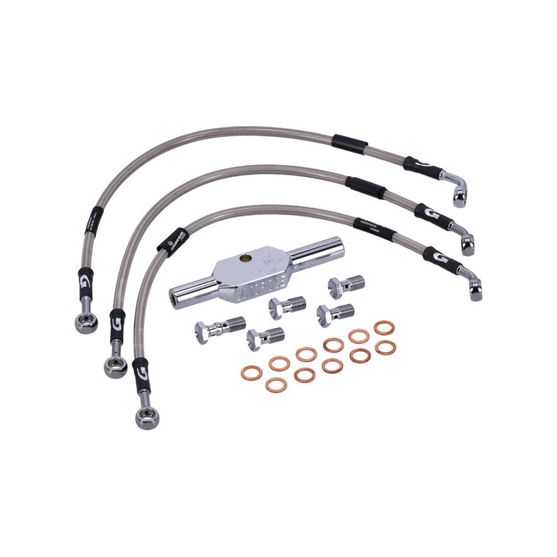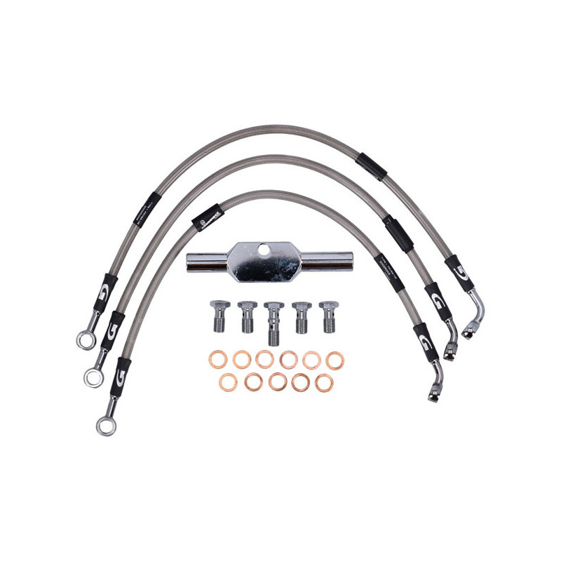 MCSStainless clear coated brake lines with high polished stainless steel hose ends. Ready to install; with correct length and fittings for stock applications.Note: With approval. Check your local MCS dealer or the MCS sales department for exact type of approval and validity on bike model and years on the test report.